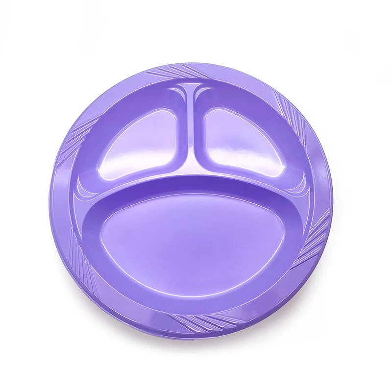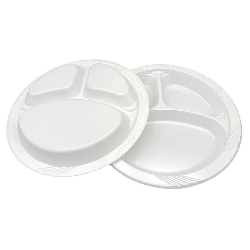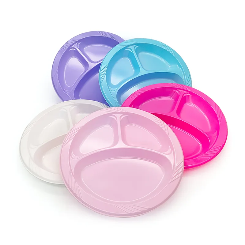 Balises actives: Assiette en plastique ronde jetable à 3 compartiments de 10 pouces, vente en gros, fabricant