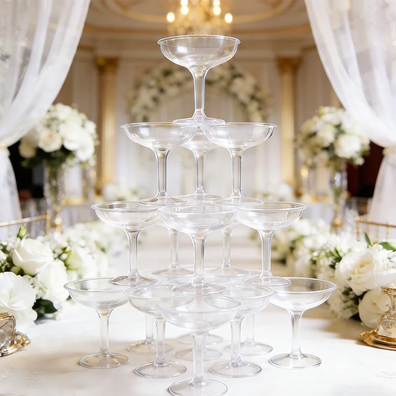 Outre la construction de base de la tour à champagne, il peut également débloquer divers scénarios. Par exemple, il peut être utilisé comme coupe à dessert pour contenir de la mousse et de la crème glacée, ou il peut convenir aux cocktails et aux réunions en plein air. Il peut être utilisé une fois puis jeté sans avoir besoin de nettoyage, et il peut également être réutilisé et stocké, assurant à la fois la protection de l'environnement et la rentabilité. C'est un article incontournable pour les secteurs du mariage, de la restauration et de la planification d'événements.